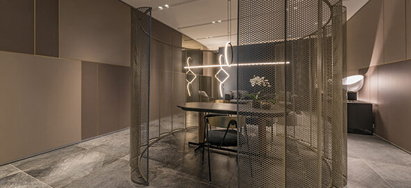 En este espacio de estar moderno el acero ocupa un lugar protagónico, ya que fue utilizado para materializar el elemento central que organiza el espacio. Se trata de un biombo realizado en chapa de acero perforada de forma hexagonal. El biombo genera en sí un sub espacio, casi como una cápsula semitransparente, sin un límite preciso. La chapa perforada permite esa sensación de transparencia, que enciende el deseo de mirar y descubrir lo oculto que siempre pertenece a una dimensión maravillosa. El biombo materializado en acero es la invitación a descubrir la propuesta.