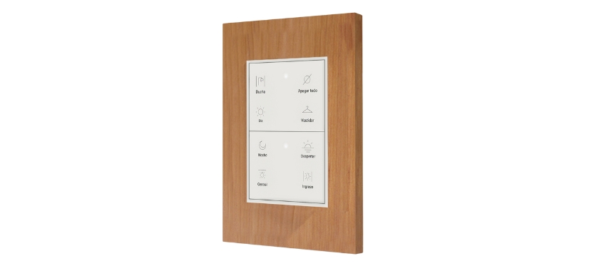 Este módulo táctil se integra con controladores programables (PLC Siemens, entre otros) y permite crear distintas ambientaciones lumínicas de manera sencilla. Con solo apoyar el dedo en una de sus cuatro zonas táctiles, el huésped accede a escenas preconfiguradas: “Welcome”, lectura, descanso, limpieza o cualquier otra que el proyecto requiera.