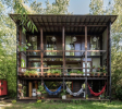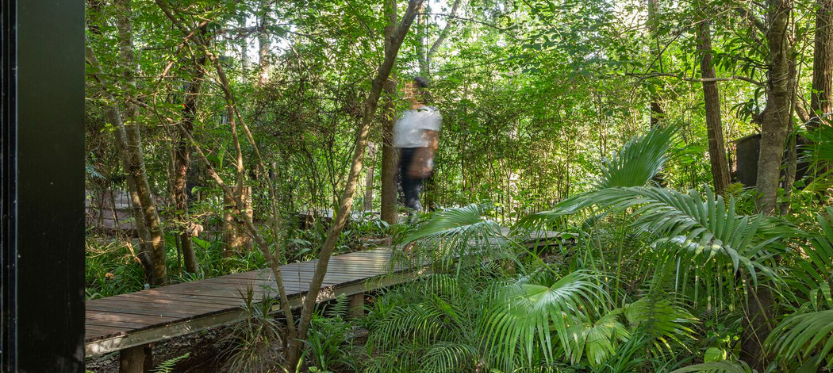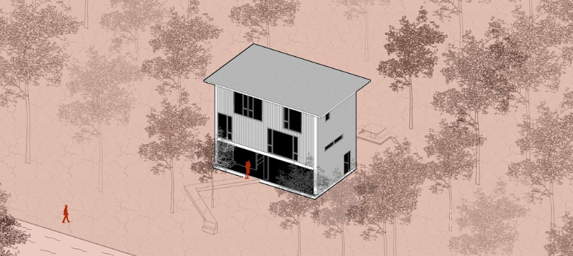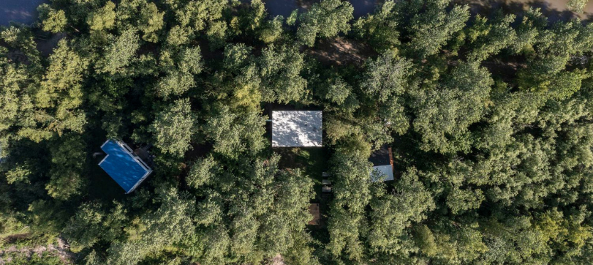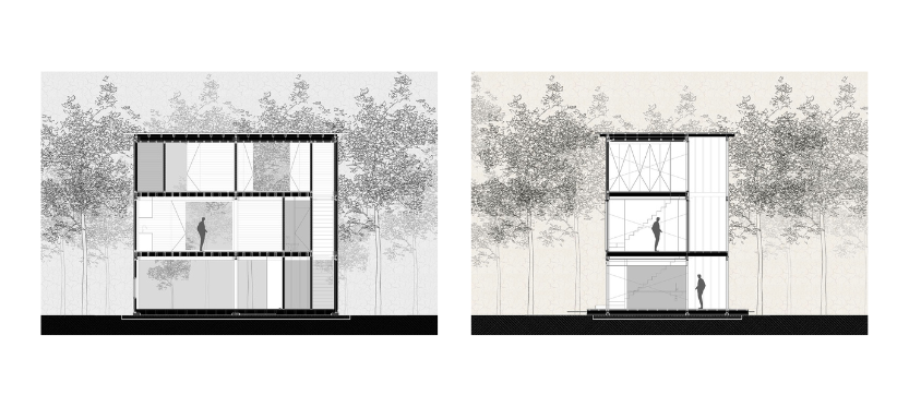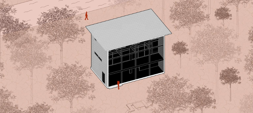 La caja negra se encuentra en una isla del delta del río Paraná, caracterizado por sus humedales, frondosa vegetación y cambiantes niveles de agua. Al fondo del solar, un vasto e impenetrable humedal con una vegetación más baja, dando la posibilidad a vistas más largas. De la implantación. Se ubica entre los árboles, escondida pero cercana al canal de acceso, liberando un espacio común al borde del agua. Se perciben entre los árboles, figuras geométricas generadas por las aberturas de la caja. A medida que se recorre el sendero de acceso, se va descubriendo la caja negra con sus llenos y vacíos que enmarcan el paisaje. La escala es proporcional al sitio, dicha monumentalidad va reduciéndose a medida que se accede.