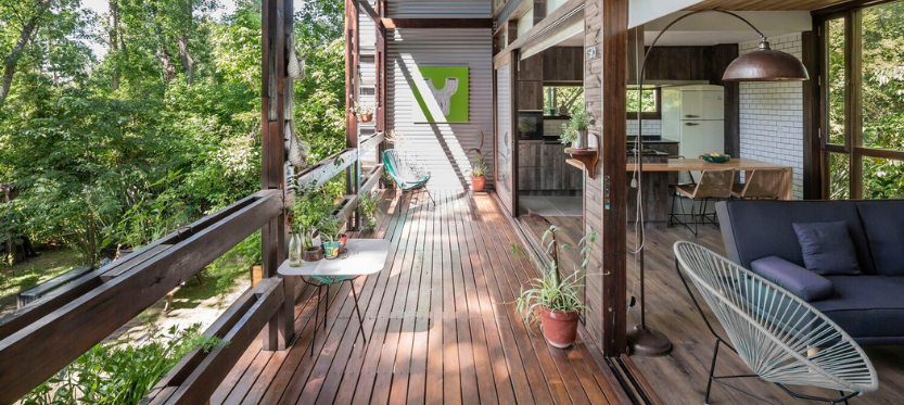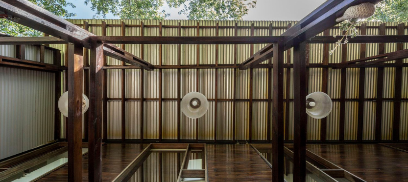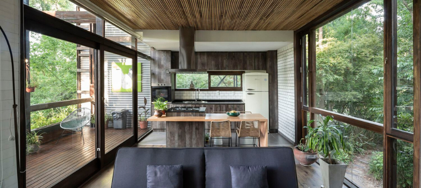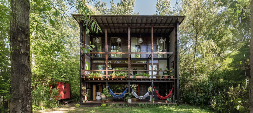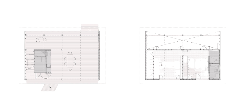 Es una clásica composición tripartita: basamento, desarrollo y coronamiento. El nivel cero se materializa como planta libre pero contenida en sus laterales, es el basamento o base del proyecto, inundable, donde se desarrollan todas las actividades relacionadas con el entorno natural. El primer nivel o el plano noble, es un espacio caracterizado por la contemplación del entorno desde la comodidad del hogar moderno; y en el segundo nivel, también parte del desarrollo, se ubican los espacios íntimos y privados del hogar, dormitorio y estudio. El coronamiento se genera por un gran techo que sobrevuela en todos sus lados. Hacia el fondo, se abre un gran semicubierto que funciona como hall de la casa y ampliación hacia el exterior del plano noble, abriéndose a la mejor orientación del sol y hacia las vistas más largas. El acceso se define por los vacíos y, la proporción de estos, al enfoque espacial del entorno.