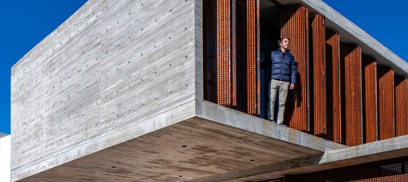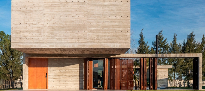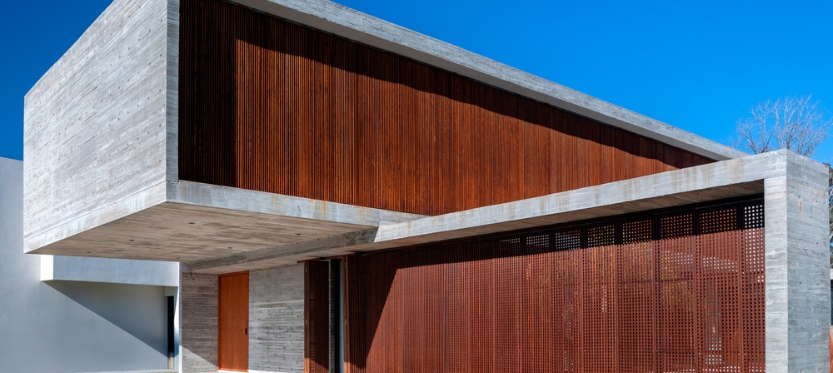 Por su parte, la planta alta destinada al sector de descanso se extiende en forma de voladizo sobre la entrada principal, creando un semicubierto para el estacionamiento de vehículos. El nivel superior cuenta con 2 dormitorios, la master suite, un hall recibidor y un lavadero. La combinación de hormigón y acero corten logra un equilibrio estético y funcional: mientras el hormigón oculta lo que se prefiere mantener fuera de vista, los parasoles móviles permite flexibilidad y comunicación con el entorno.