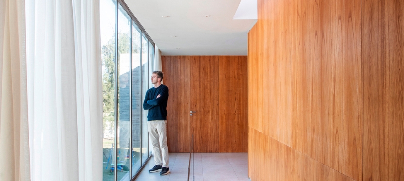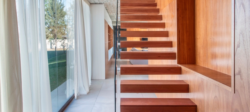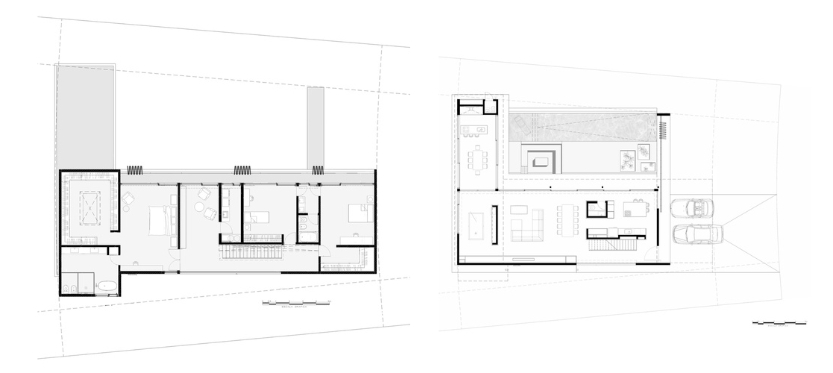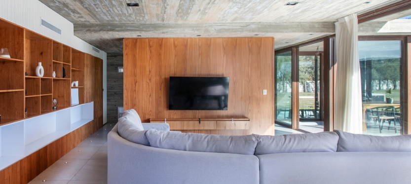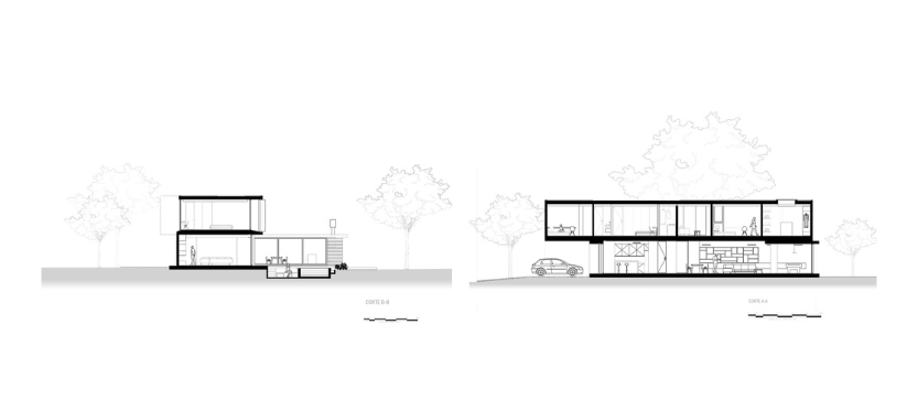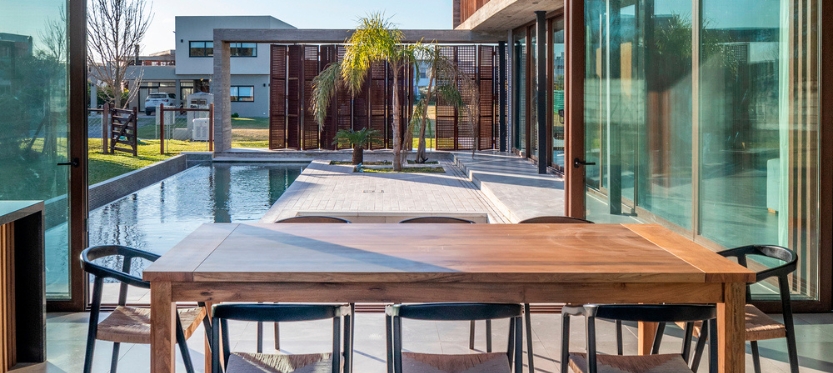 Una tira inferior conforma el área social mientras que la caja superior se destina al área privada que apoya en dos tiras en el sentido opuesto. La planta baja, compuesta por la cocina, el living, el comedor y una sala de pool cuenta con grandes aberturas que permiten la continuidad visual entre el interior y el exterior. A su vez, cuenta con una galería que se vincula directamente con el corazón de la casa. Como mencionamos anteriormente, toda esta planta baja vive muy de cerca lo que sucede en el sector de pileta y chill out.