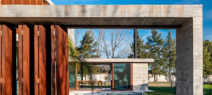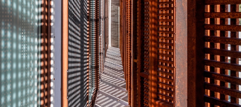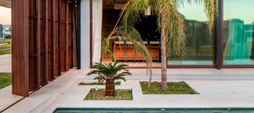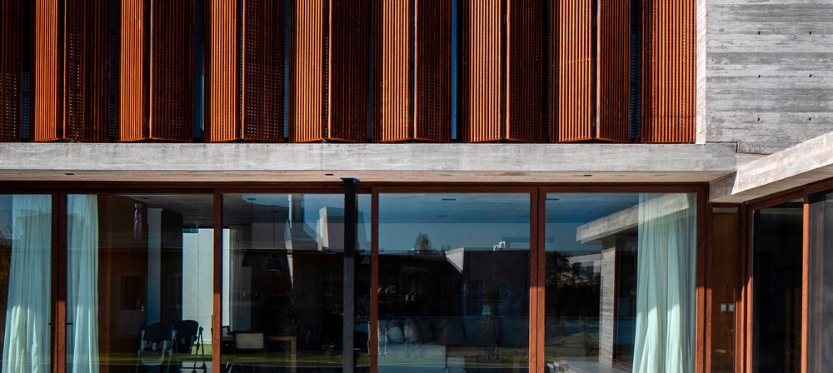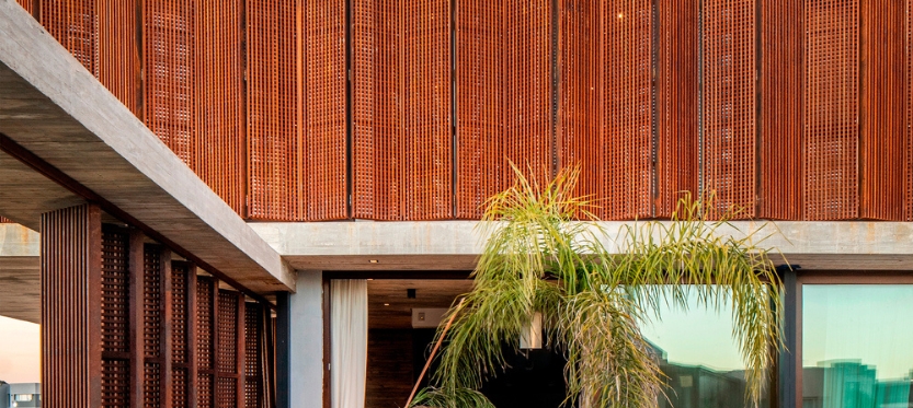 Uno de los elementos distintivos de Casa Guayubira es el uso de parasoles semipermeables de acero corten que filtran la luz natural en las habitaciones. De este modo, sse proporciona privacidad tanto en el interior como en la zona de la pileta. Estos parasoles no solo protegen de miradas externas, ofrecen un juego de luces y sombras que enriquece la experiencia sensorial del espacio y por último resguarda a la vivienda de los calores del oeste que tanto agobian en el hemisferio sur