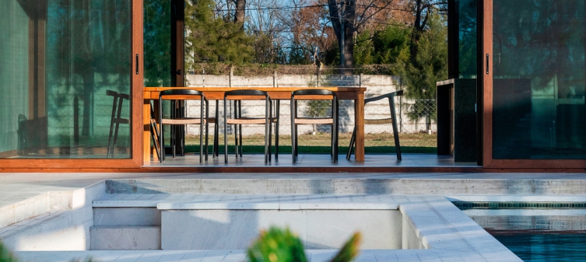 Una de las premisas fue integrar elementos exteriores a la arquitectura generando una simbiosis entre ambos. El diseño en forma de C surge a partir de la ubicación estratégica de la pileta y el área de chill out en uno de los laterales del terreno. De este modo, envuelve y crea un entorno íntimo y protegido.