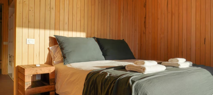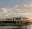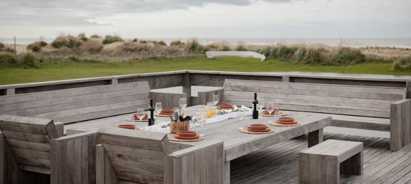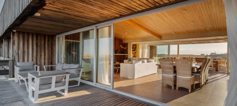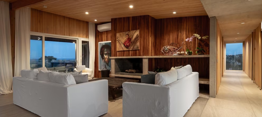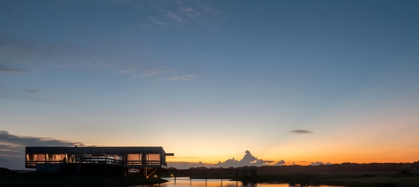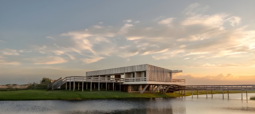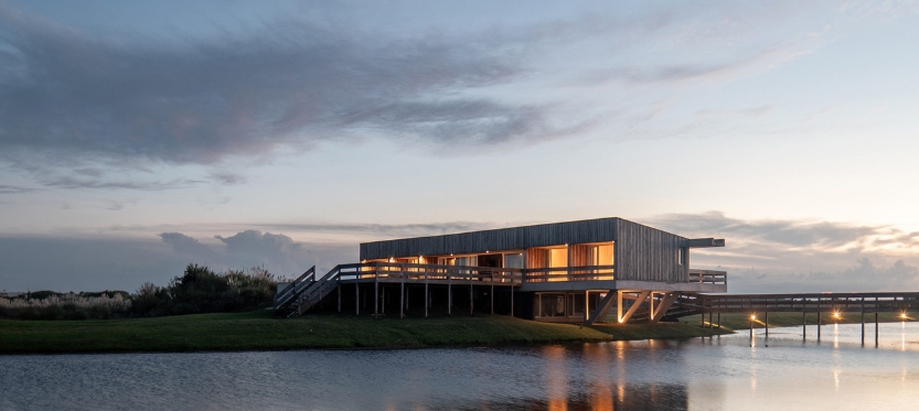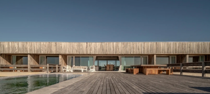 Construida en hormigón y madera combina sostenibilidad y estética acorde al entorno marítimo. La Casa Lobos de Mar cuenta con un muelle que cruza un espejo de agua dulce existente, mientras los techos canalizan las lluvias hacia la laguna a través de un canalón de hormigón, integrando así arquitectura y naturaleza en un ciclo perfecto.