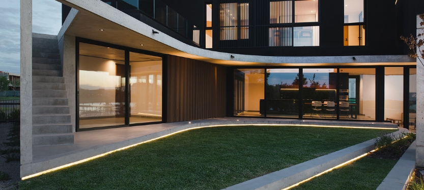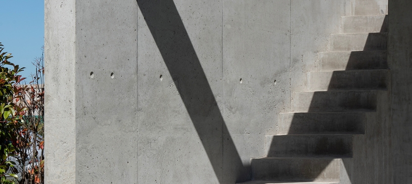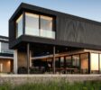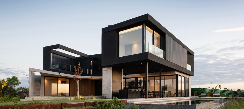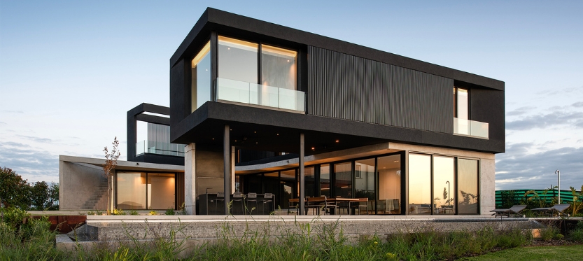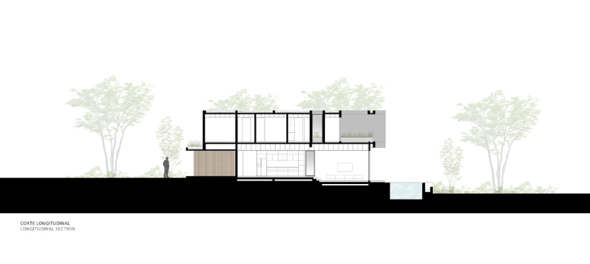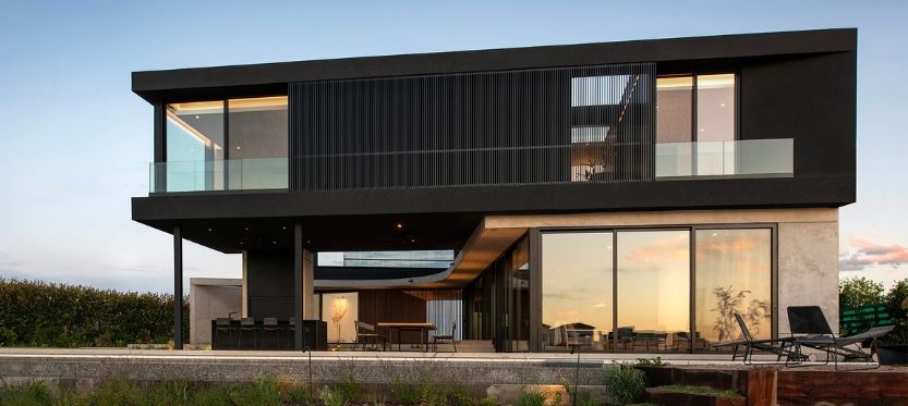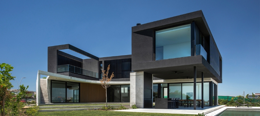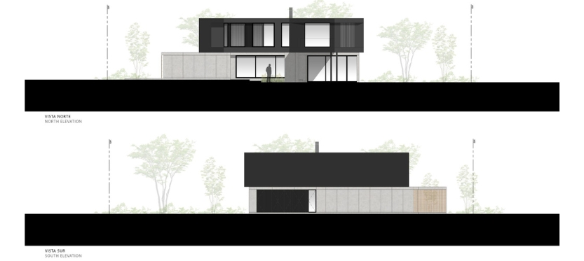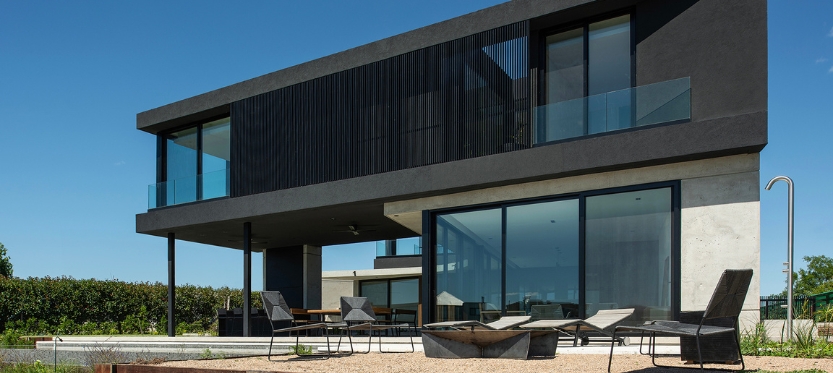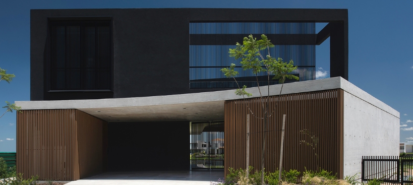 La materialidad de la casa se resuelve con una planta baja de hormigón visto encofrado con fenólicos y celosías de madera, y la planta superior con un revoque negro y celosías de aluminio.