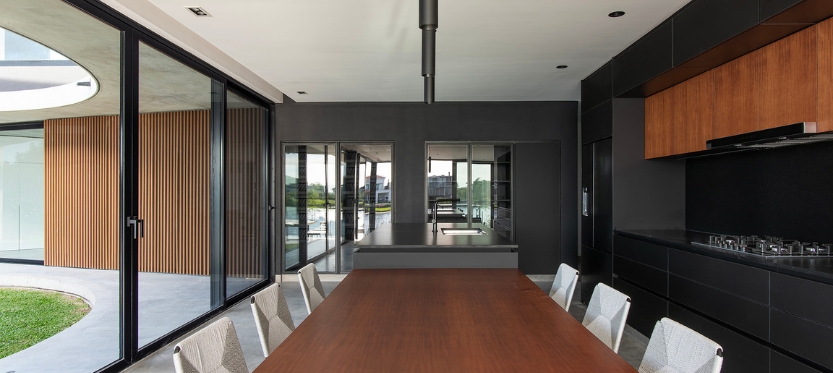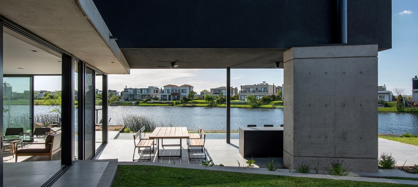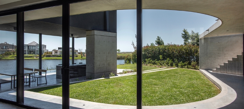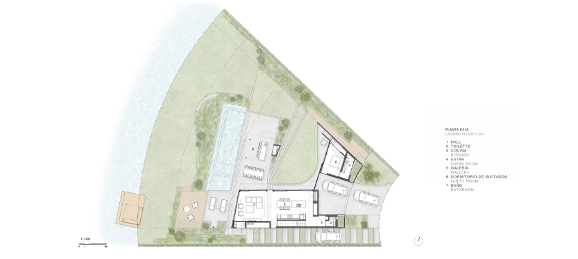 La planta baja se trata como un único ambiente público con una cocina que es protagonista absoluta. Esta está ligeramente elevada por sobre el estar con la idea de que este último no corte las vistas hacia el agua. El estar se extiende a una amplia galería que incluye la parrilla y está rodeada de parque por tres de sus lados. El programa en planta baja incluye una suite de invitados que debe tener independencia del volumen principal. El semicubierto curvo permite conectar este ambiente con el resto de la casa.