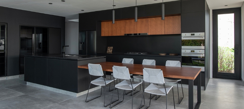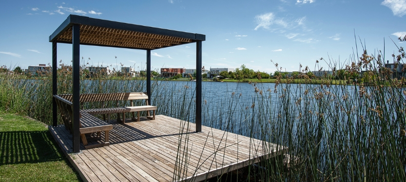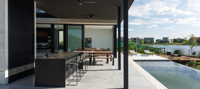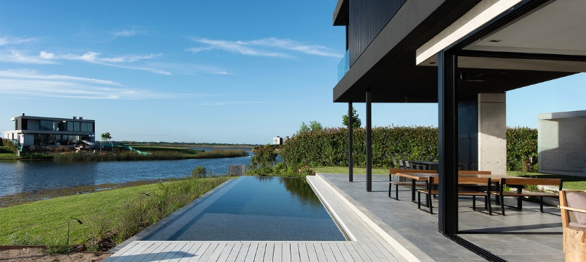 Por otro lado, la pileta se pensó con un borde infinito para que se mimetice con la laguna que está enfrente. Para compensar el desnivel natural del terreno e integrar el interior y el exterior, los escalones del estar se extendieron hacia el jardín.