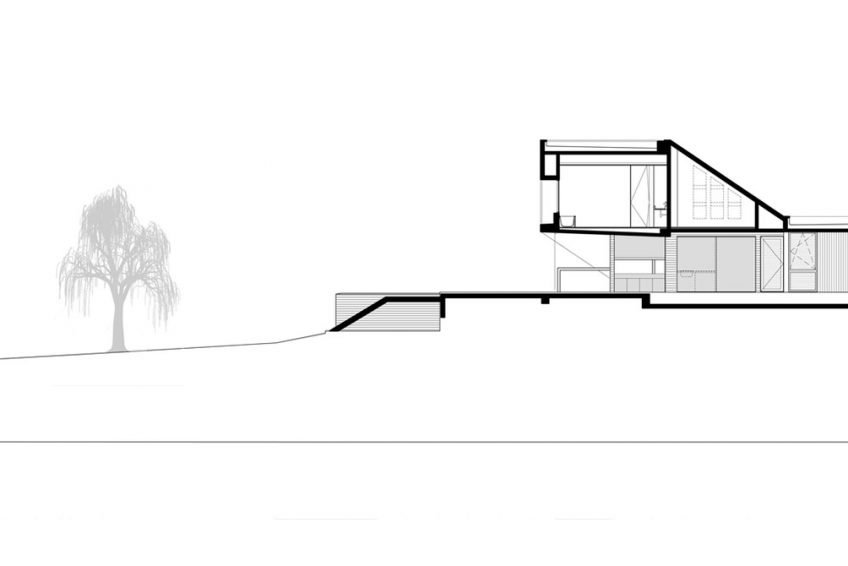 La casa parece emerger de la naturaleza en un intento de capturar el paisaje y hacerlo propio. La intención fue conformar un conjunto que fusionara en un solo concepto la estructura, el programa y la materialidad, un sistema donde los componentes se fusionen pero cada uno conserva su lógica interna. El concepto estructural se basa en la disposición de dos tabiques y una gran viga desde la que cuelga la planta alta. La losa inclinada de la cubierta se comporta como vínculo. Estos elementos se abren y cierran, son opacos o se perforan respondiendo a las necesidades funcionales a la vez que enfatizan las visuales y dirección de los recorridos.