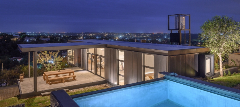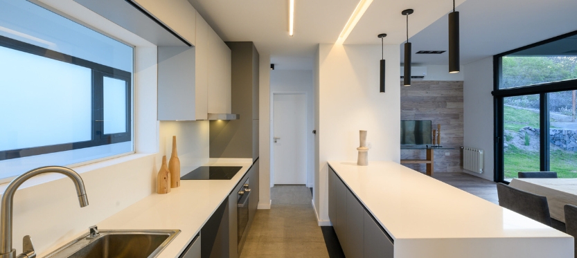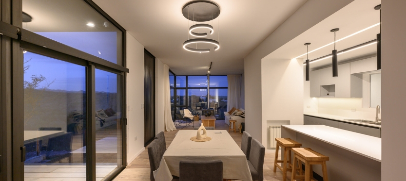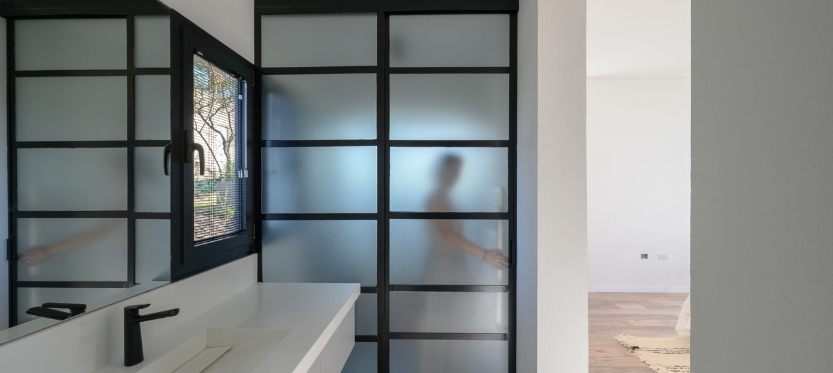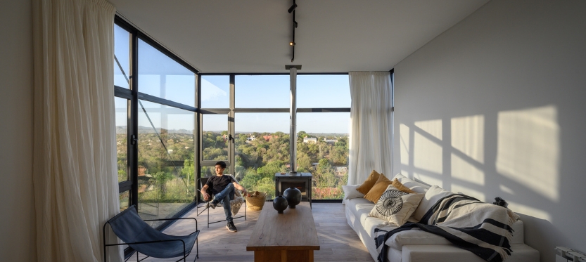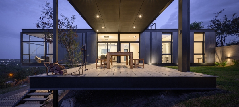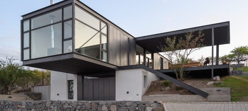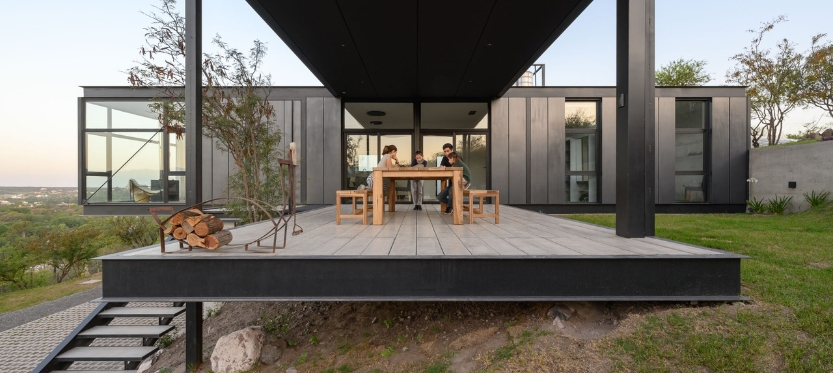 La materialidad, meticulosamente seleccionada, subraya la dualidad funcional de cada espacio. Baños, cocina, lavadero y depósito se presentan como volúmenes sencillos, de revoques en blanco y con aberturas modestas. En contraste, la sala de estar, el comedor y el dormitorio principal se envuelven en la estructura metálica, revestida de chapa en un tono gris oscuro que contrasta con lo sólido de la construcción tradicional. Sus grandes ventanales se convierten en lienzos transparentes que conectan el interior con la naturaleza circundante.