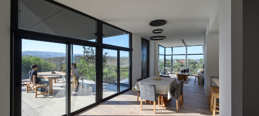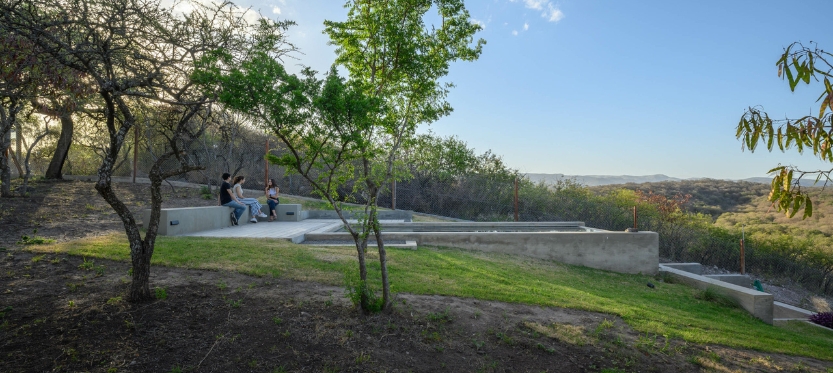 Una sucesión de terrazas meticulosamente diseñadas invita a los residentes a disfrutar del exterior, transformando el paisaje en un escenario vivo. La arquitectura dialoga con la naturaleza mediante el uso de muros de hormigón y gaviones que, rellenos con piedra local, evocan a las montañas y destacan los árboles nativos. La incorporación estratégica de plantas de las sierras cordobesas, como las gráciles Gramíneas y las imponentes Cortaderas, ayudan a enmarcar estos espacios. En la primera un jardín; en la siguiente la llegada; en la tercera una expansión de la galería y la casa; y en la última la pileta y un bosque de quebrachos, algarrobos y garabatos.