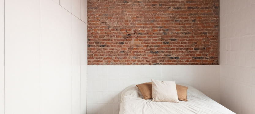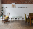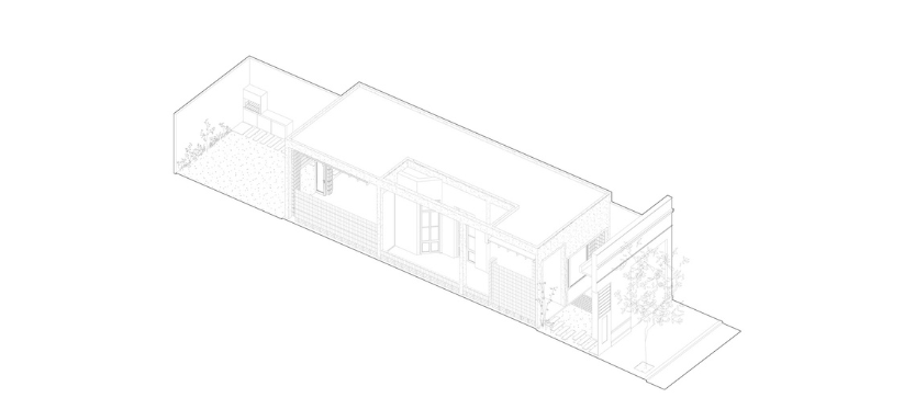 Una última operación, introduce dentro de la casa un objeto conformado con tejuelas de ladrillos nuevos, que va configurando las distintas funciones: Desde el volumen del baño y la cocina, los vanos que conectan con el exterior, hasta el mobiliario fijo de la casa. Se elije la tejuela por su escala humana, más domesticable que el hormigón, y por ser el material que predomina en la construcción preexistente. Adentro la tejuela se pinta de blanco generando un contraste y afuera se deja a la vista mezclándose las viejas paredes con las nuevas tejuelas.