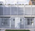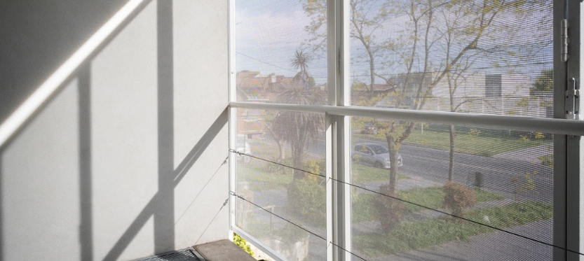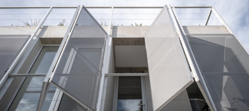 Tanto el movimiento, como las transparencias definen el lenguaje y construyen un nuevo paisaje dinámico como parte del ecosistema urbano. Las expansiones junto con la envolvente textil trabajan a su vez en conjunto como dispositivo de regulación térmica colaborando en términos bio-climáticos y mejorando los niveles de eficiencia energética de las viviendas, como estrategia de diseño pasivo. Las mallas de metal desplegado resuelven el solado de las expansiones del nivel superior generando una mayor fluidez espacial entre los tres niveles, incorporando así también las transparencias en el límite horizontal. A su vez, su permeabilidad colabora con la búsqueda de maximizar el aprovechamiento de la luz para los espacios interiores del nivel cero.