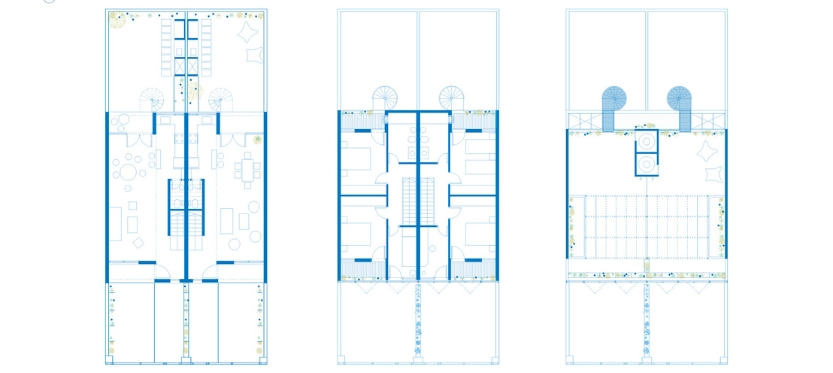 Las áreas sociales de las casas PSS se enraízan en el nivel cero en relación con la tierra; los espacios íntimos de dormir con sus respectivas expansiones. Un tercer espacio de uso indeterminado se organiza en el nivel intermedio. A su vez, la cubierta en el nivel superior remata como espacio de uso exterior recuperando la superficie ocupada por el espacio interior. Una estructura metálica define sutilmente el espacio aéreo dándole escala humana, posándose sobre la cubierta actuando como soporte de múltiples actividades posibles. Ya sea para fijar estructuras livianas móviles o textiles, se plantea como un espacio plus que permita eventualmente cerrarse o abrirse de manera dinámica adaptándose a distintos usos, dependiendo la época del año y el clima. Las escaleras helicoidales por su parte, operan como sistema circulatorio que conecta los tres niveles de expansiones manteniéndolos articulados en vertical.