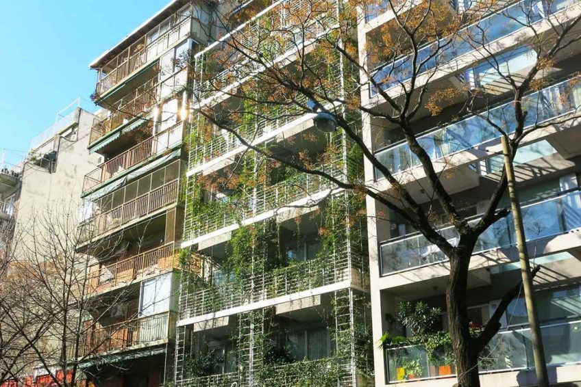 Las fachadas cuentan con estructuras de hierro especialmente diseñadas para guiar el crecimiento de dos jardines verticales con más de 800 plantas a lo largo de 28 metros de altura. La vegetación absorbe CO2 y ayuda a controlar la ganancia solar.