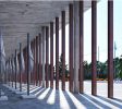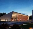 concentración de personas: exposición y auditorio, y un espacio de menor altura, enmarcado en una caja baja de hormigón, donde se resuelven las oficinas y las actividades de apoyo a las funciones principales.