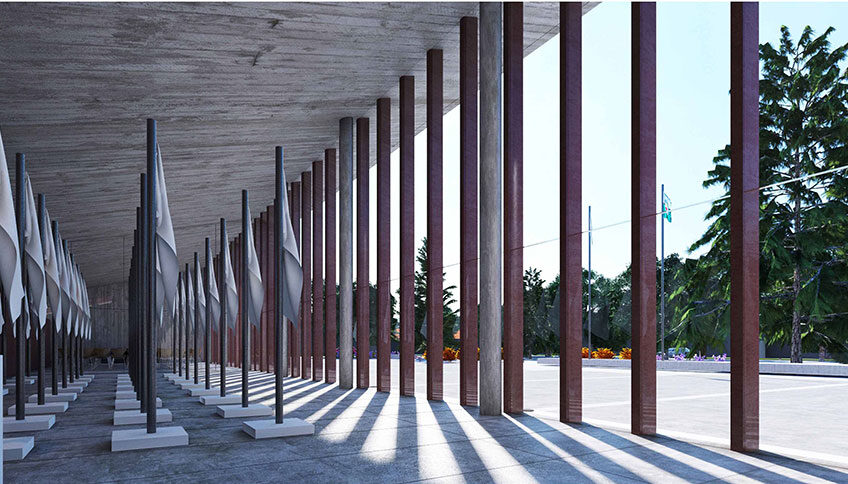 Sobre el atrio se destaca como una“escultura”, un elemento predominante que contiene las Banderas a las cuales se les rinde homenaje: la Bandera Argentina y la Bandera de la Provincia de Buenos Aires.