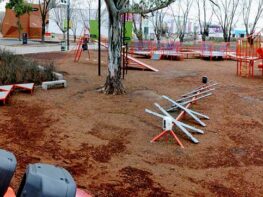 Las plazas están incomunicadas, por lo que el proyecto se ocupa de homogeneizar sus solados, juegos, equipamiento, vegetación. Dos pérgolas en Unamuno, y una en Magaldi, si disponen enfatizando la especial situación espacial, funcionando también como señal a escala urbana: las pérgolas indican que en esos interiores de manzana hay un espacio público. Las pérgolas indican, además, la zona seca de la plaza, donde se ubican mesas de ping pong, ajedrez, espacios de descanso.