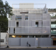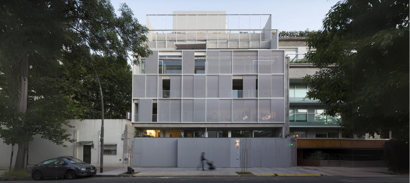 La fachada del edificio acompaña este proceso transicional: los paneles corredizos de tela tensada, mientras colaboran con el control térmico, lumínico, la absorción acústica y el ahorro energético, generan -a lo largo del día- diferentes diálogos entre quienes habitan la vivienda y el entorno que la contiene.